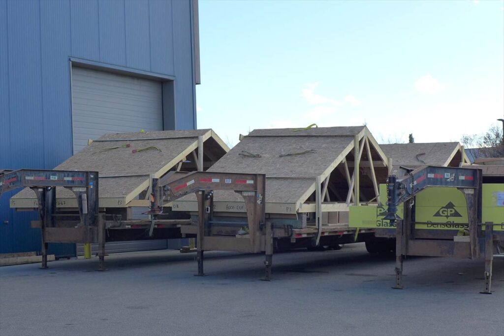整理整頓された広い工場内で、壁のパネルはもとより屋根・小屋組まで作成し、作成した部材を大型トラックで現場まで運搬し大型クレーンにて組み立てする事により、大工職人不足に対応して作業の効率化を図り、同時に建築コストの抑制にも貢献しているそうです。