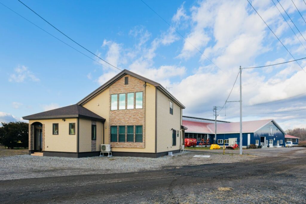 「酪農業で土ぼこりや虫が多い環境なので、汚れが目立ちにくい色にしました」と落ち着いたデザインに仕上げた外観。
