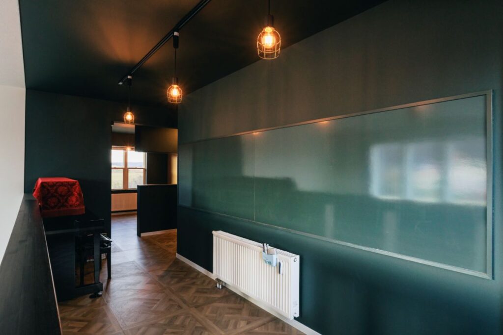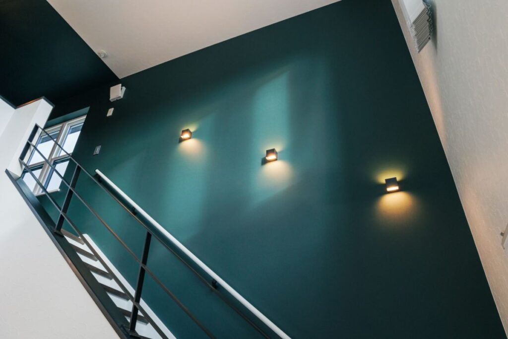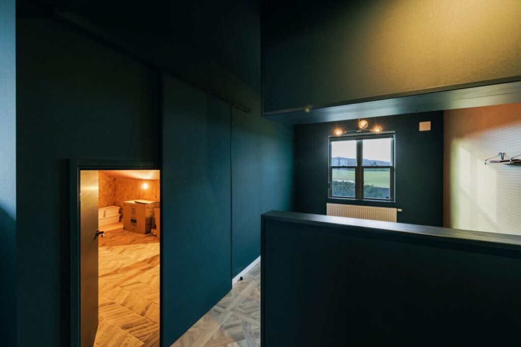 2階はガラリと雰囲気を変えてレトロな雰囲気に。子ども部屋になる予定の部屋の前には、いつかお子さんが生まれたらゆったりと絵を描いて楽しめるようにと、壁の色に合わせた緑色のホワイトボードを設置しました。