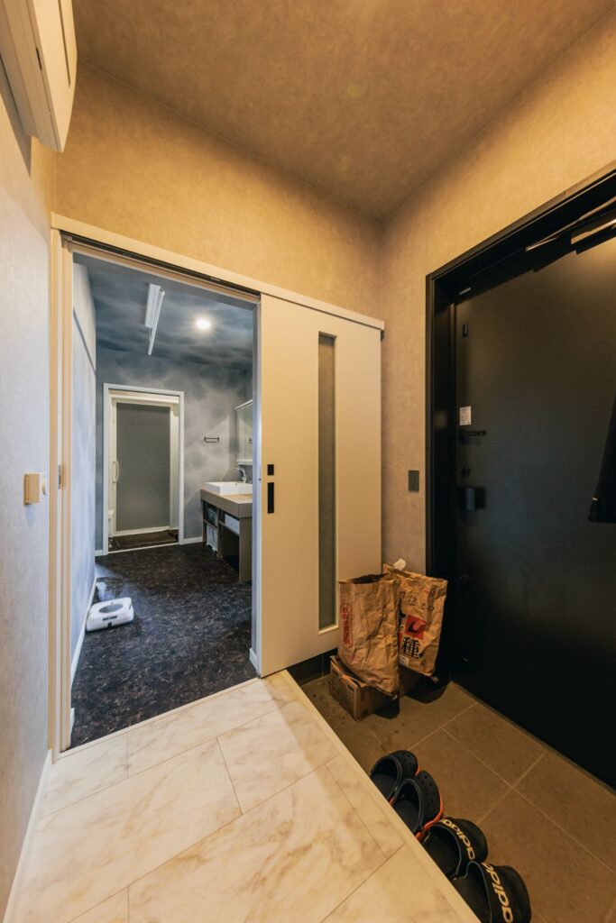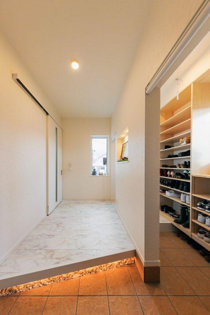 玄関には上がり框の下に白い玉砂利を敷き、洋風な中に落ち着いた雰囲気をプラスしました。段差に入れた間接照明が来客をあたたかく迎えます。