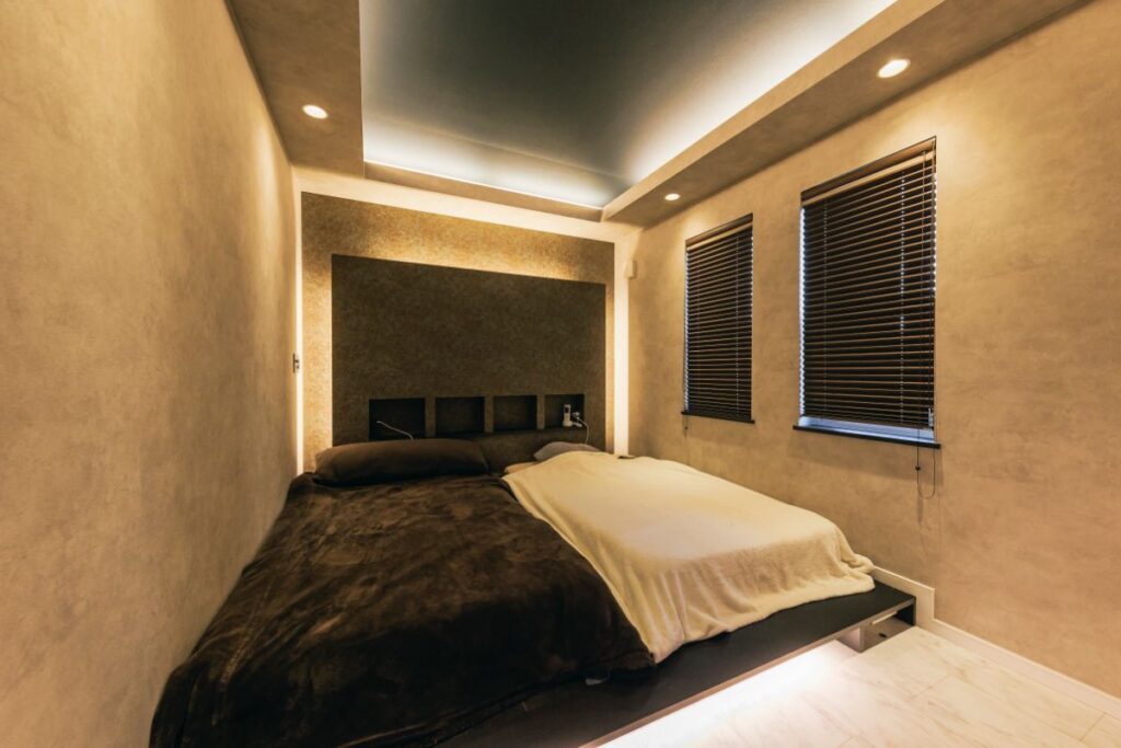 こちらは自らイメージ画を描いたという寝室。天井、ベッド下、背面の3箇所に仕込んだ間接照明が、リラックスタイムを柔らかに包み込みます。