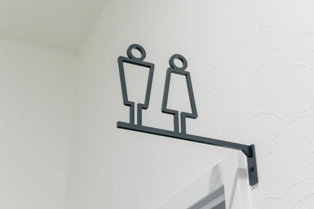 「お客様が迷わないように」と奥様が選んだトイレ表示。おもてなしの心が光ります。