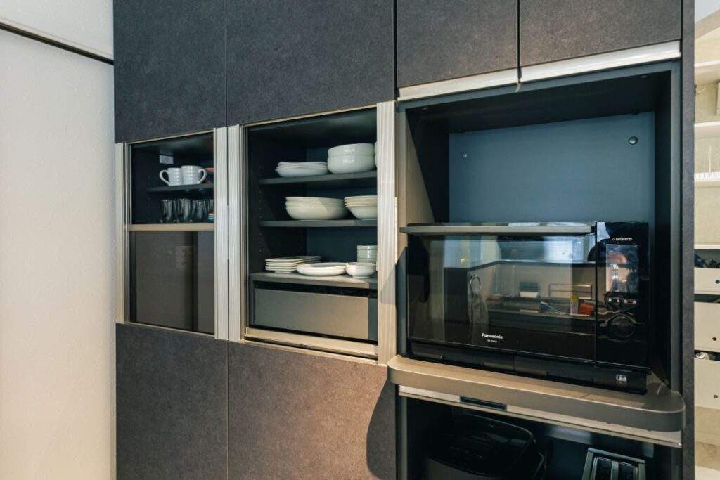 食器棚は扉全体を開けなくても中段の「窓」から物を出し入れできる「2ウェイクローゼット」を採用、不要なものを見せずにスマートに食器を取り出すことができます。