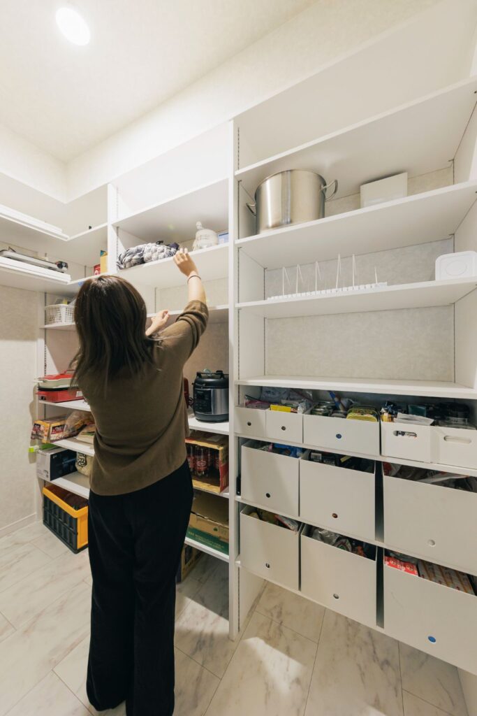 「キッチンにカウンターを作ったらどうしてもその上に物を置いてしまう気がして。代わりにパントリーにスペースを作ったんです」と奥様。大容量のパントリーにはストック品だけでなく家電なども並んでいますが、来客からは一切見えません。おかげでキッチンは常にモデルルームのような美しさです。